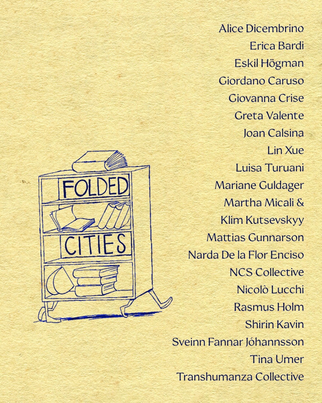 Alice Dicembrino, Erica Bardi, Eskil Högman, Giordano Caruso, Giovanna Crise, Greta Valente, Joan Calsina, Martha Micali & Klim Kutsevskyy, Lin Xue, Luisa Turuani, Mariane Guldager, Mattias Gunnarson, Narda De la Flor Enciso, NCS Collective, Nicolò Lucchi, Rasmus Holm, Shirin Kavin, Sveinn Fannar Jóhannsson, Tina Umer, Transhumanza Collective.